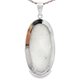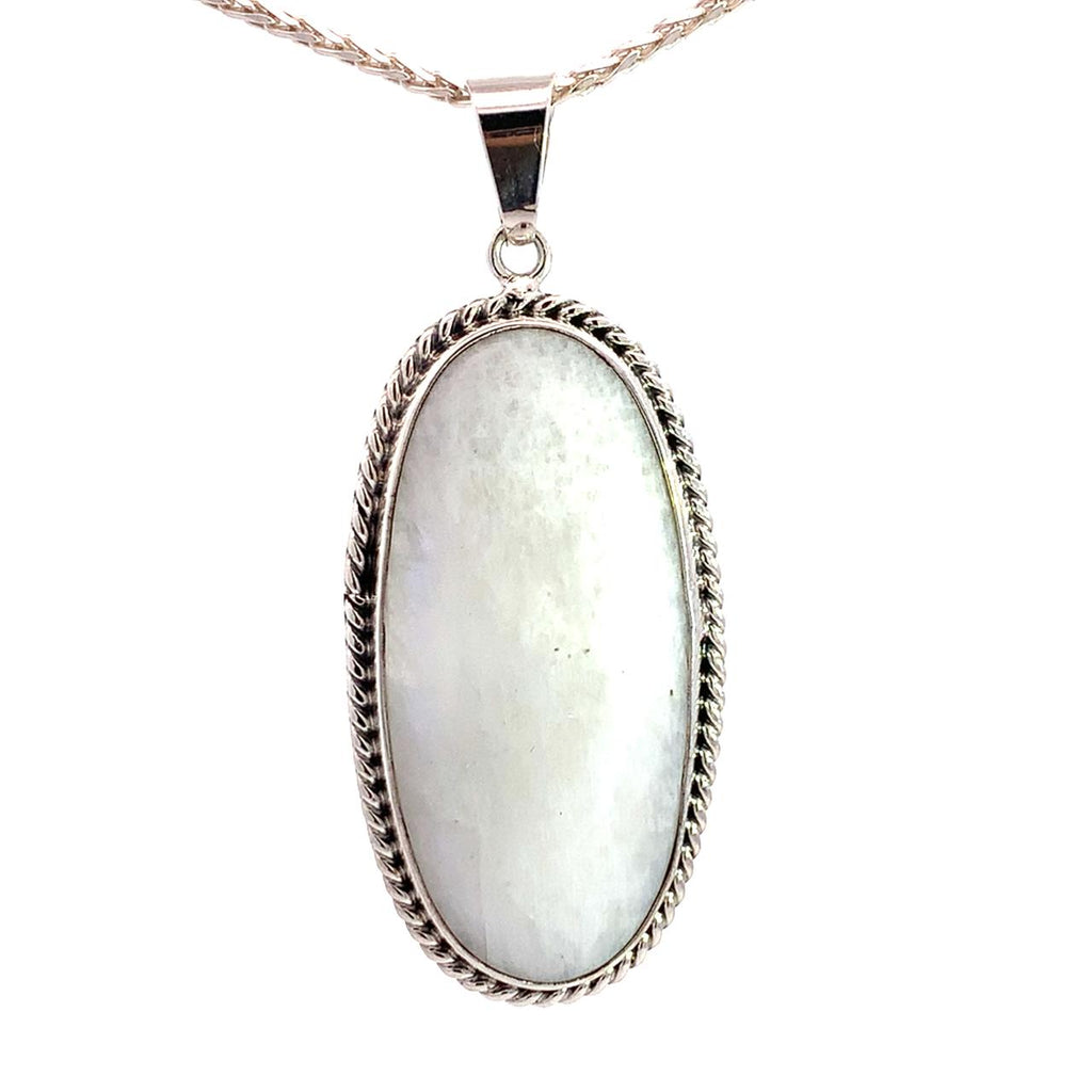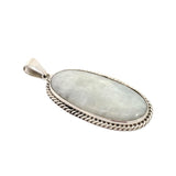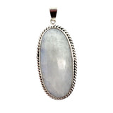 Featuring a long oval cabochon White Moonstone bezel set in a twisted wire frame, this stunning piece measures 65 x 28mm and includes a shiny bail for easy wear.